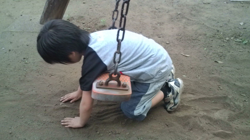 (↓ブランコに乗りながら、砂で何かをつくる6歳児)